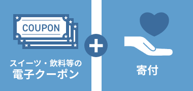 全員にお店で使用できる複数の電子クーポンの中から、お好きなものを1つ進呈します。あわせて各種団体の活動を支援できる「寄付」も選択することができます。